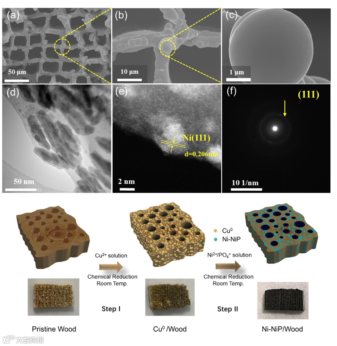 两步法制备过程包括在未处理的木材上沉积铜,然后负载Ni-Ni P催化剂。原木中含有丰富的-OH基团,对金属阳离子表现出优异的吸附能力。在此,Cu2+离子大量吸附在木材表面,以Cu0的形式被还原,提高了木材的导电性,有利于Ni-NiP催化材料的进一步沉积。通过SEM可以发现Ni-NiP微米级颗粒包覆在原始木材的骨架上。这些颗粒大小均匀,分布均匀。在制备过程中,Ni - Ni P催化剂以球形不断堆叠,增大了催化剂的比表面积。TEM图像显示了从Ni - NiP / W电极获得的Ni - NiP催化剂的透射电子显微镜( TEM )图像。在木材上的沉积物中观察到许多纺锤状的纳米颗粒作为晶体Ni。