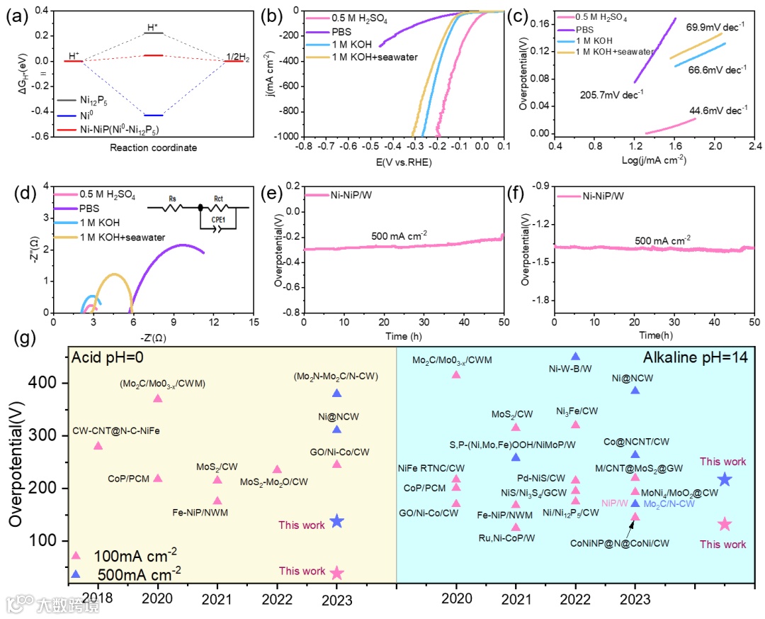 采用密度泛函理论(DFT)计算,Ni-NiP ( Ni6-Ni12P5 )的最佳Δ GH *为0.045 eV,具有最佳的催化活性。这一计算结果证实了Ni-NiP催化剂,特别是Ni12P5和Ni6的组合,具有优异的催化性能,其中晶态和非晶态结构之间的协同作用增强了氢吸附,提高了HER催化活性。同时,Cu和Ni-NiP催化剂在原木上的紧密包覆有利于电荷转移,而Ni-NiP/W电极的超亲水和超疏气特性增强了传质(电解质和气体)。因此,Ni-NiP/W电极在较宽的pH范围和海水中表现出优异的HER性能,超过了许多其他木基催化电极。特别是,在酸性和碱性条件下,它只需要小于300 mV的过电位就可以提供1000 mA cm-2的高电流密度。值得注意的是,Ni-NiP/W在500 mA cm-2的大电流密度下表现出长期稳定性。