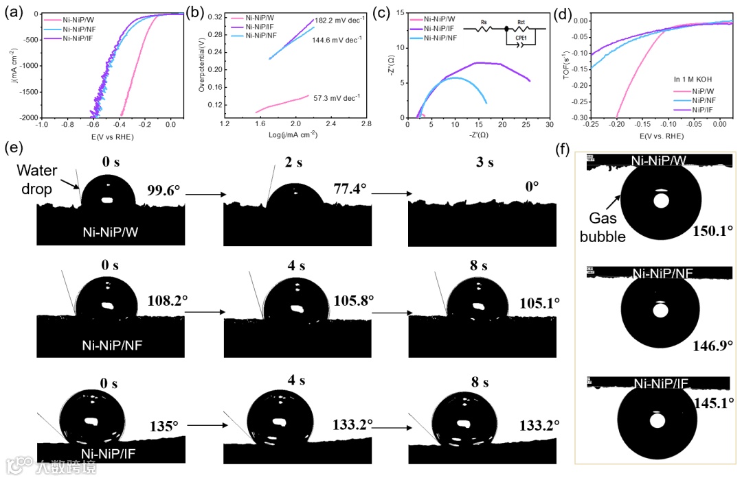 图4. a ) Ni-NiP/W、Ni-NiP/NF和Ni-NiP/IF在1 m KOH中的电化学性能和润湿性测试结果。