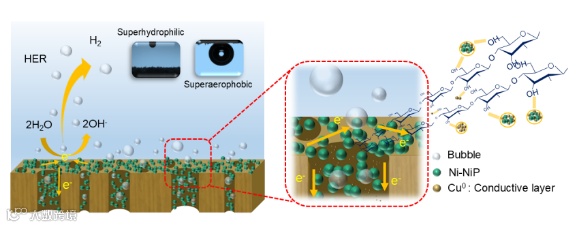 图1. 超亲水/超疏气Ni-Nip/W电催化剂的设计。
