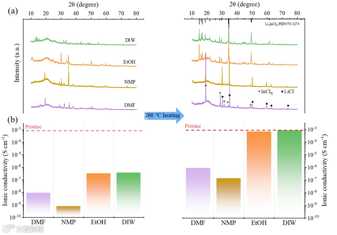 图 3. LIC暴露不同溶剂后的恢复性测试。在 200 °C条件下热处理前后残余粉末(LIC-DMF、LIC-NMP、LIC-EtOH 和 LIC-DIW)的(a)XRD; (b)离子电导率。
