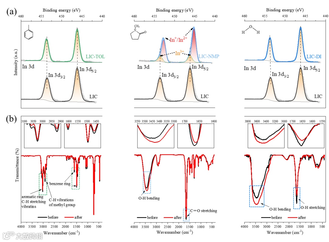 图 4. LIC在三种溶剂中的反应机理。LIC暴露于TOL、NMP、DIW溶剂前后的(a)XPS和(b)FTIR。