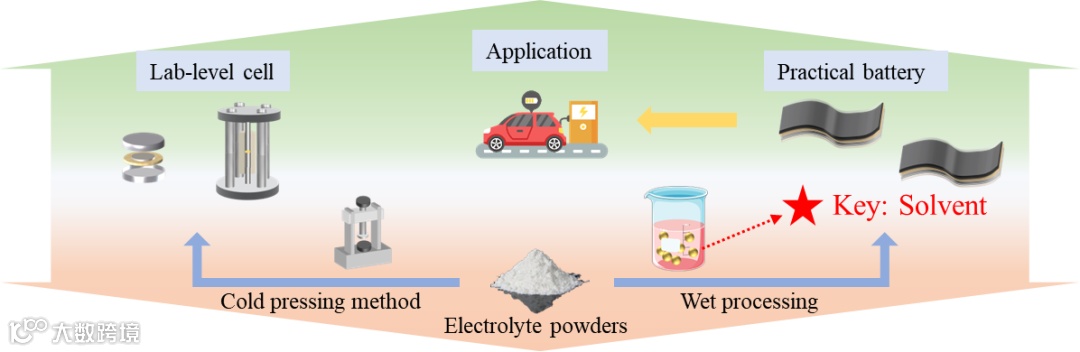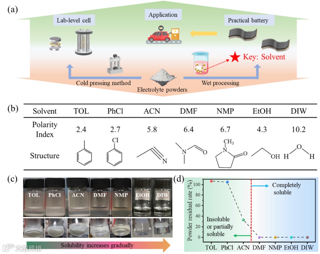 目前,全固态电池(ASSB)主要采用粉末压制法来制备,该方法主要适用于实验室研究,因此,ASSB的规模化制备仍是一大挑战。湿法工艺如浆料涂覆法是商业上最成熟的电池生产工艺,从传统锂离子电池向固态锂电池过渡的过程中,由于其对制造基础设施的改动最小,成本低廉,且与现有工艺的兼容性好,因此,采用湿法工艺大规模生产固态电池仍然是首选,开发固态电解质(SSEs)薄膜制备的湿法工艺对ASSB的工业生产具有重大意义。从这个角度来说,了解SSE的溶剂稳定性是使用湿法工艺实现 ASSB 工业化生产的先决条件。此外,在目前研究的SSEs中,卤化物SSEs由于其高离子电导率、本征氧化稳定性和机械性能等优势,得到了广泛关注和迅速发展。同时卤化物SSEs可以通过溶液法规模化合成,制备简单成本低,满足商业化应用是对低成本的要求。然而,迄今为止,卤化物SSEs和溶剂的稳定性尚未得到系统的研究。因此,研究卤化物SSEs对有机溶剂的敏感性对于推动卤化物固态电池的产业化至关重要。
