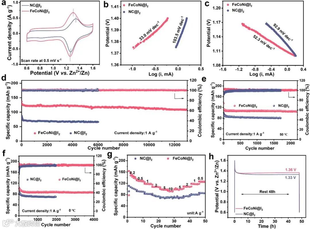 图3(a)Zn//FeCoNi@I2和Zn//NC@I2在0.5 mV s-1扫速下CV曲线的氧化还原电位差的比较;Zn//FeCoNi@I2和Zn//NC@I2的塔菲尔斜率计算在(b)氧化和(c)还原过程;Zn//FeCoNi@I2和Zn//NC@I2电池在1A g-1电流密度下的循环性能在室温下为(d),在50℃的高温下为(e),在0℃的低温下为(f);(g)Zn//FeCoNi@I2和Zn//NC@I2倍率性能电流密度为0.2、0.5、1、2、5和10A g-1的电池;(h)Zn//FeCoNi@I2和Zn//NC@I2自放电性能。