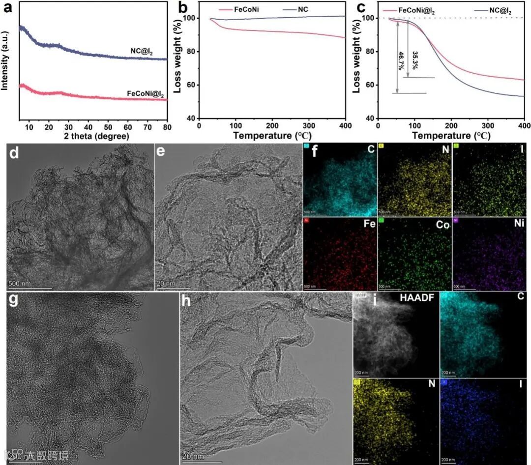 图2(a)NC@I2以及FeCoNi@I2复合材料XRD图谱;(b)NC和FeCoNi样品的热重曲线,以及(c)NC@I2以及FeCoNi@I2复合材料;(d)TEM、(e)HRTEM和(f)元素映射图像FeCoNi@I2样品;(g)TEM、(h)HRTEM和(i)元素映射图像NC@I2样品。