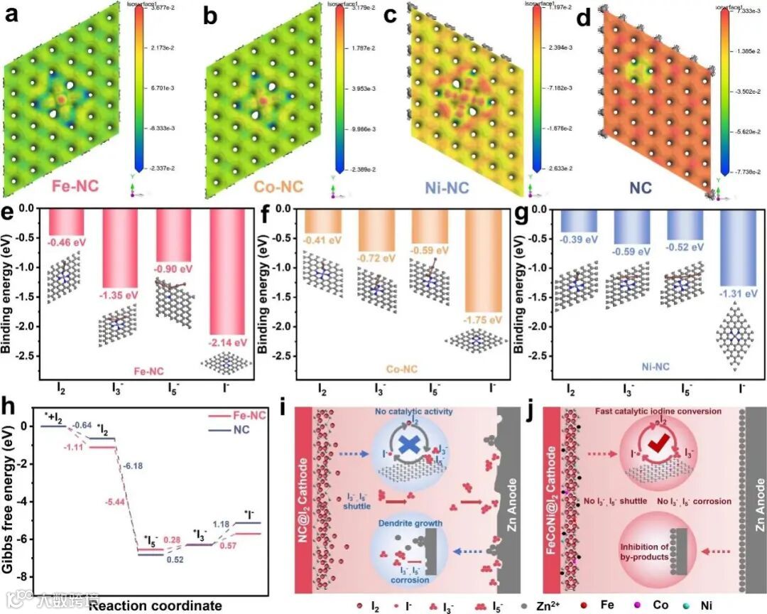 图5(a)Fe-NC、(b)Co-NC、(c)Ni-NC和(d)NC模型的微分电荷密度;I2、I3-、I5-和I-物种的(e)Fe-NC、(f)Co-NC、(g)Ni-NC模型的计算结合能;(h)计算了Fe-NC催化剂和NC催化剂驱动的连续碘还原反应过程(I2→I-)中吉布斯自由能的变化;(i)Zn//NC@I2和(j)Zn//FeCoNi@I2不同反应机理的示意图。