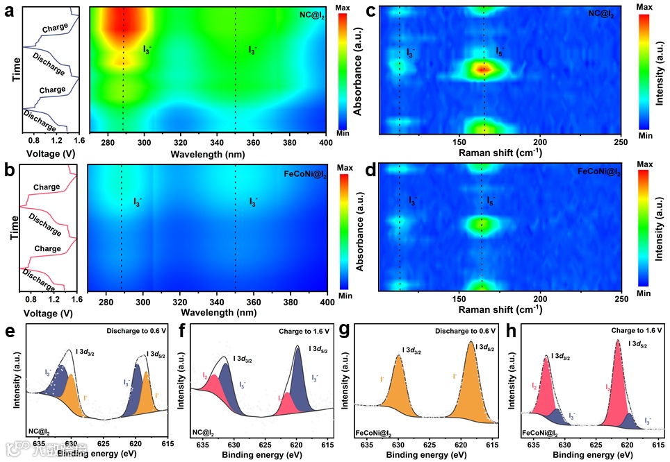 图4(a)Zn//NC@I2和(b)Zn//FeCoNi@I2循环过程中的原位紫外-可见光谱;(c)Zn//NC@I2和(d)Zn//FeCoNi@I2循环过程中的原位拉曼光谱;(e-f)NC@I2和(g-h)FeCoNi@I2正极处于完全放电和充电状态下非原位I 3d XPS。