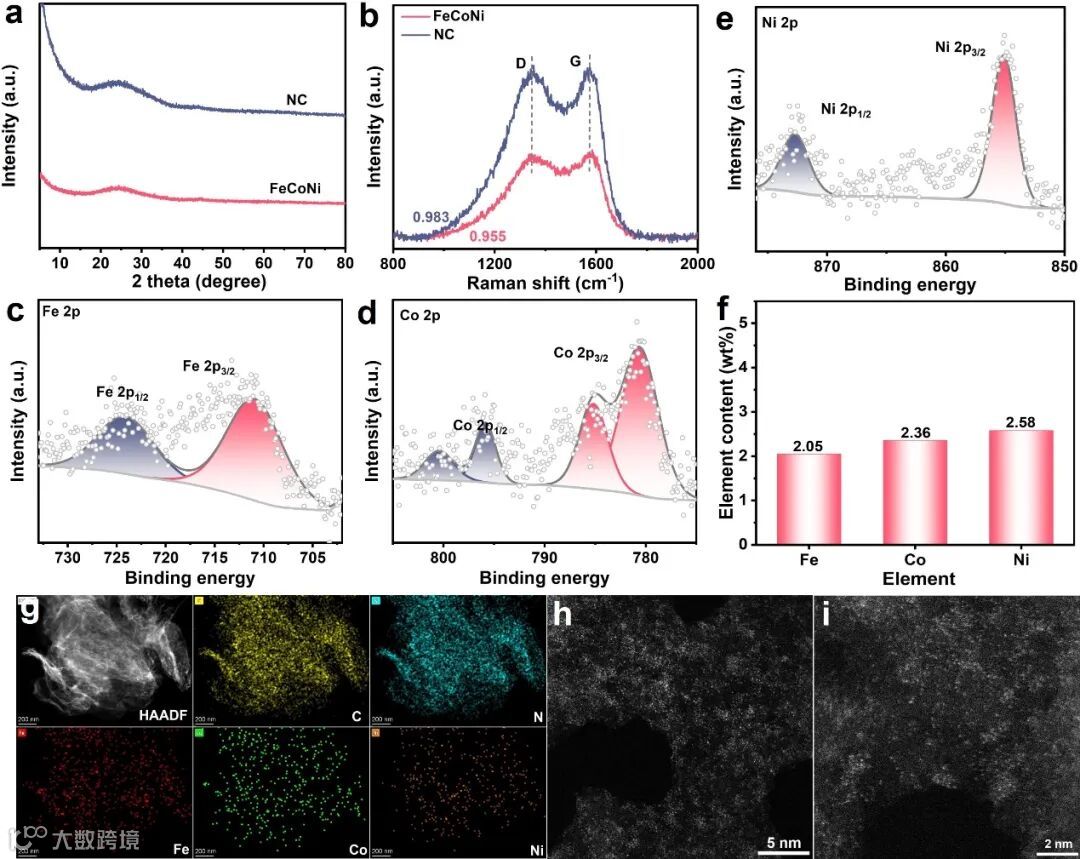 图1(a)NC和FeCoNi样品的XRD图谱(b)拉曼光谱;FeCoNi样品的高分辨率(c)Fe 2p、(d)Co 2p和(e)Ni 2p光谱;(f)电感耦合等离子体质谱法(ICP-MS)测试FeCoNi样品中Fe、Co和Ni元素的质量比;(g)以及FeCoNi样品的(h-i)HAADF-STEM图像。