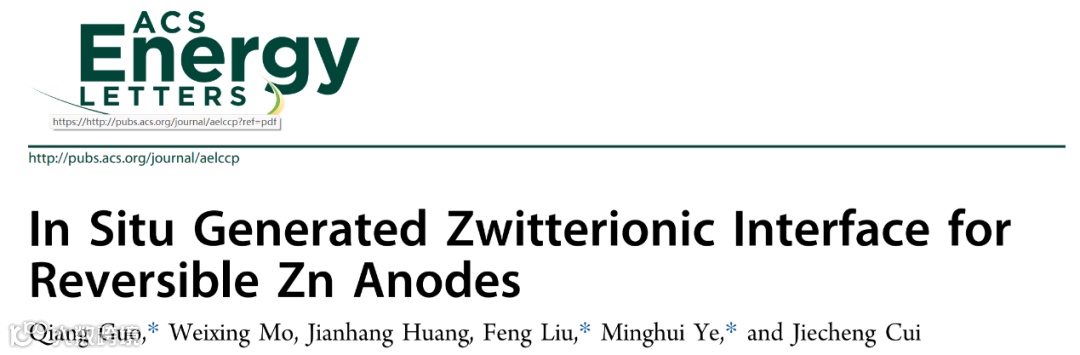 近日,来自浙江师范大学郭强博士与中国科学院力学研究所刘峰副研究员、广东工业大学叶明晖副教授合作,在国际知名期刊ACS Energy Letters上发表题为“In Situ Generated Zwitterionic Interface for Reversible Zn Anodes”的研究文章。该文章通过一种简单而有效的聚合策略在Zn负极上构建了原位生成的两性离子聚合物界面{聚[3-(1-乙烯基-3-咪唑)-丙磺酸盐]}来解决电解质与负极界面间的不稳定性问题。