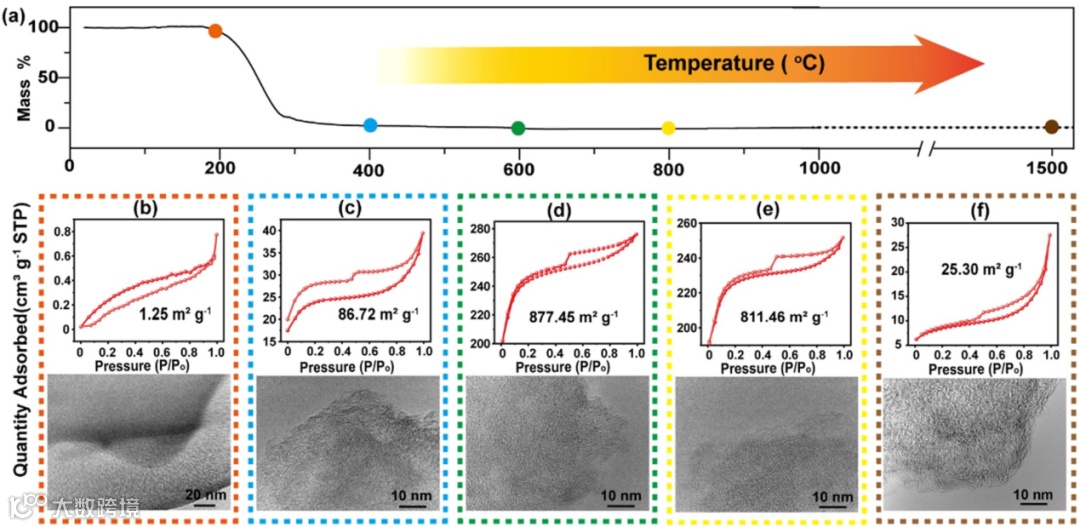 图3. 不同温度下得到的YP-50F/聚乙二醇样品及其N2吸脱附曲线和HRTEM图。