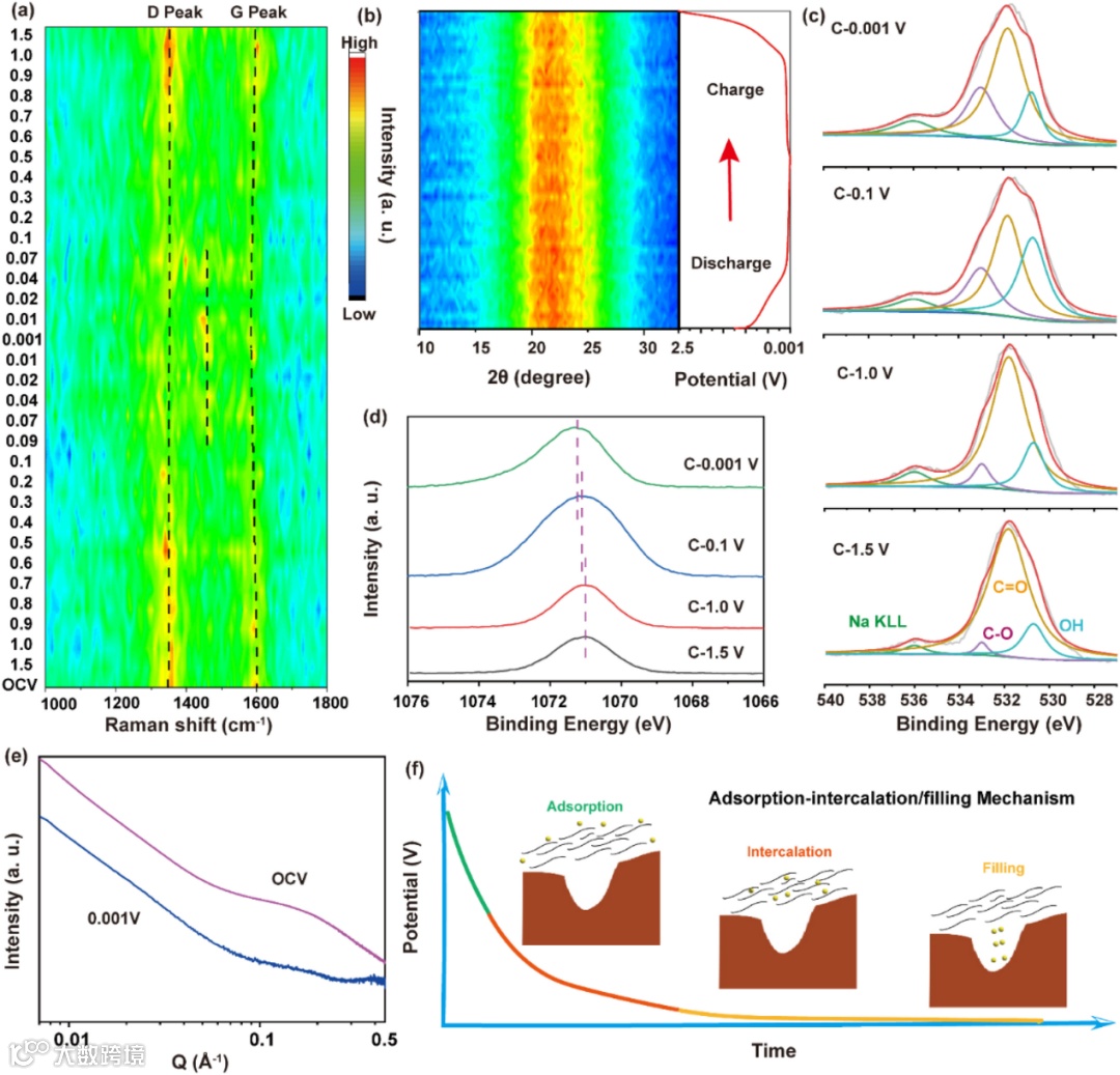 图6. PAC-10电极的(a)原位拉曼光谱、(b)原位XRD图谱、(c)O 1s和(d)Na 1s 离位XPS光谱。(e) PAC-10在OCV和放电至0.001V状态的阶段的SAXS。(f) 钠储存机制的图示。