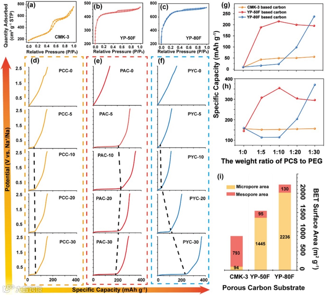 图2.(a)CMK-3,(b)YP-50F和(c)YP-80F的N2吸附/解吸等温线。(d)PCC、(e)PAC和(f)PYC的充电曲线。样品的(g)平台容量和(h)总容量值。(i) 多孔碳的比表面积。