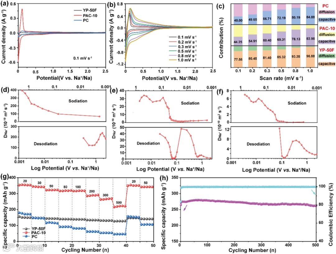 图5.(a) 电极材料在0.1 mV s-1下的CV曲线。(b) PAC-10在0.1-1.0 mV s-1的不同扫速下的CV曲线。(c) 电极材料在0.1–1.0 mV s-1扫速下的电容贡献。通过GITT计算的(d)YP-50F、(e)PAC-10和(f)PC样品的DNa+值。(g) 电极材料的倍率性能,以及(h)PAC-10在300 mA g−1下的循环性能。