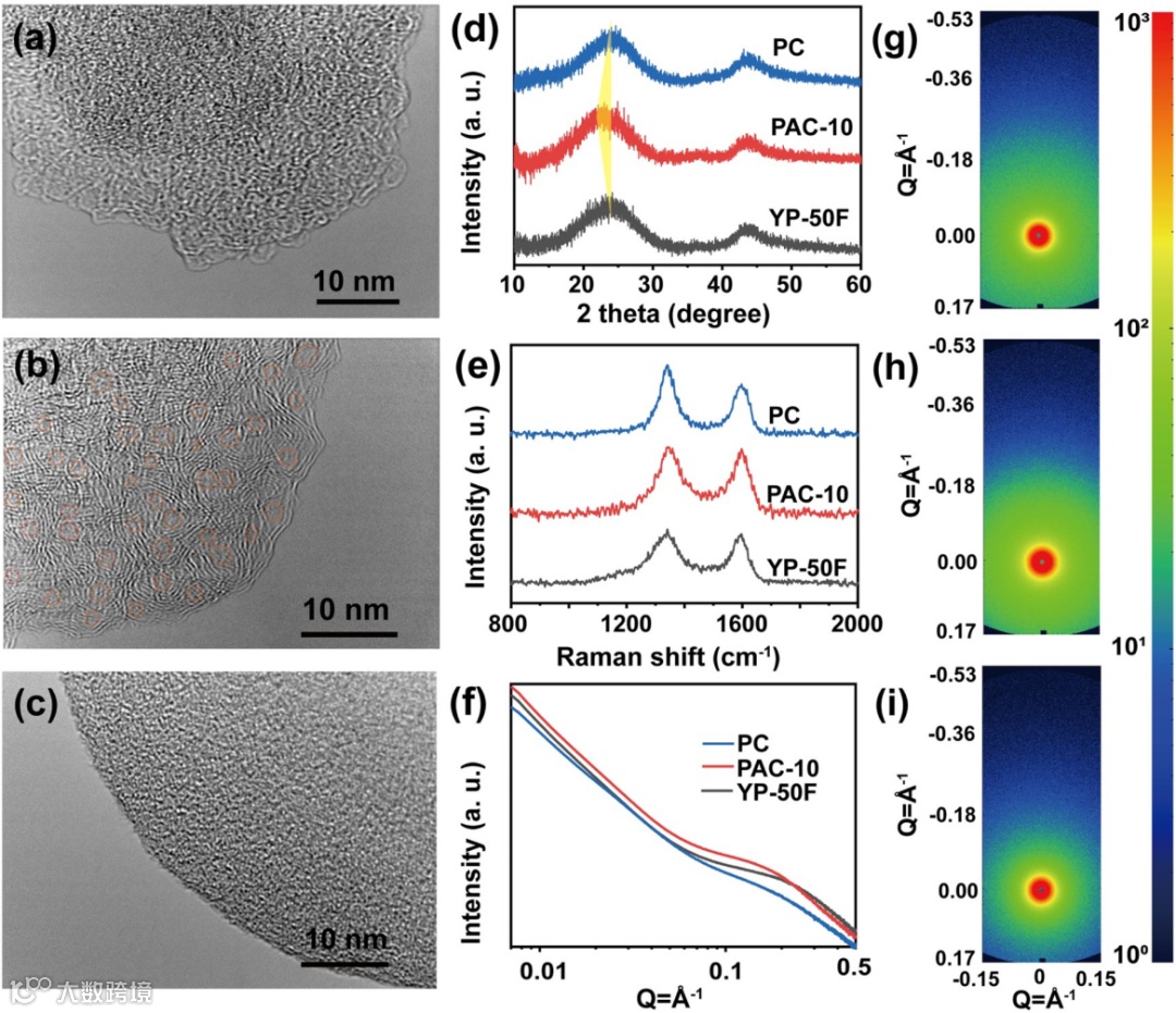 图 4. YP-50F,PAC-10,和聚乙二醇衍生碳(PC)的HRTEM,XRD,Raman和SAXS表征。