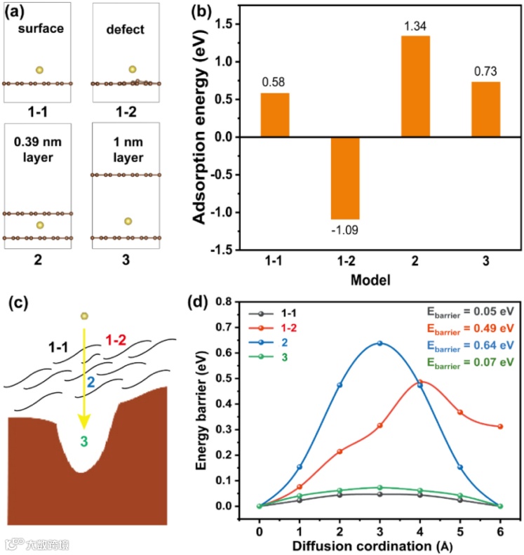 图7. (a)吸附模型,(b)吸附能,(c)PAC中的Na+传输示意图,和(d)Na+在碳表面、缺陷和0.39 nm和1 nm碳层中的扩散势垒能。