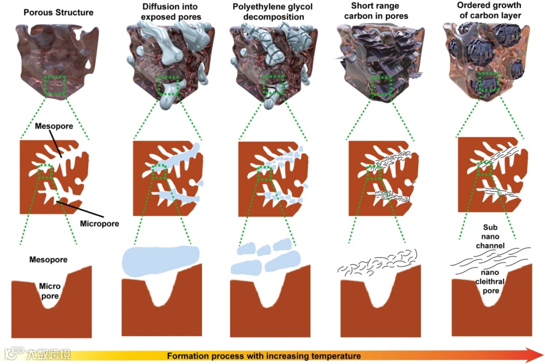 通过对同温度下得到的YP-50F/聚乙二醇样品进行分析,可以看出聚乙二醇先分解成小片段的无序碳,再在高温下重排形成有序的碳微晶。