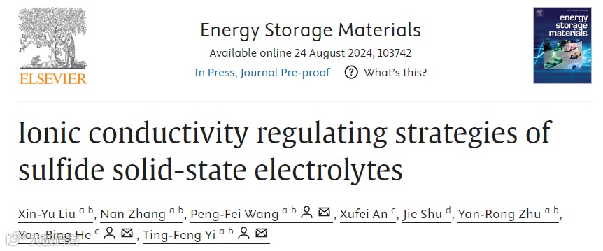 近日,来自东北大学秦皇岛分校的伊廷锋教授团队和清华大学深研院贺艳兵教授团队合作,在国际知名期刊Energy Storage Materials上发表题为“Ionic conductivity regulating strategies of sulfide solid-state electrolytes”的观点文章。该文章聚焦于硫化物SEs的离子电导率改进研究。总结了离子掺杂、锂含量调控及工艺优化等策略,旨在提升硫化物SEs性能。并展望了硫化物基全固态锂电池的研究方向和未来。
