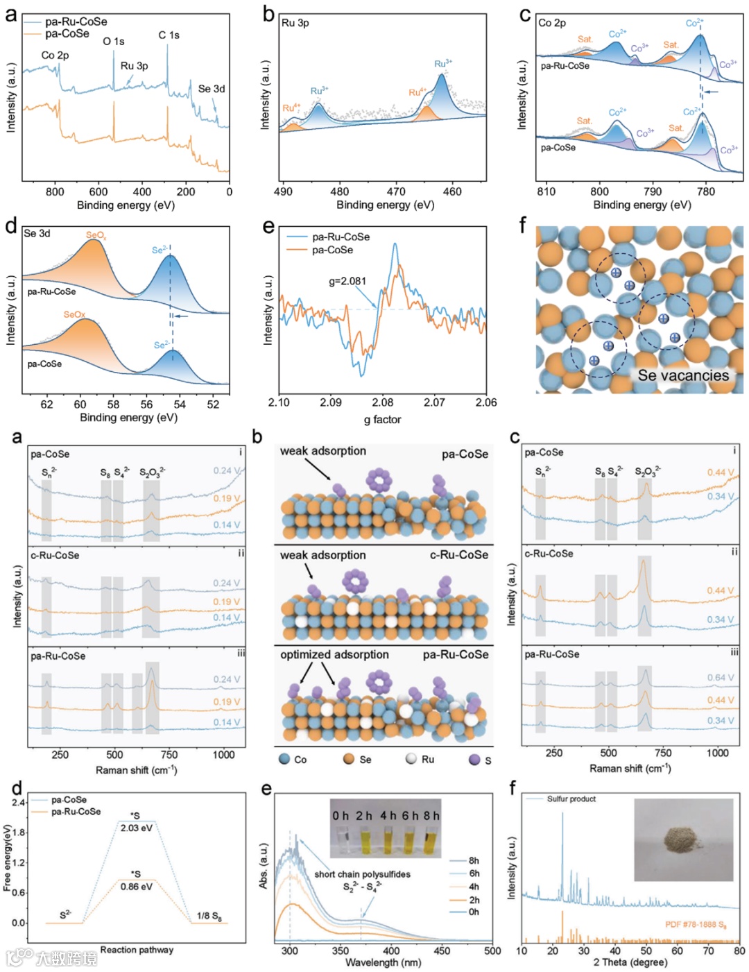 实验和XPS以及原位拉曼光谱表明,pa-Ru-CoSe的催化活性来源于Ru的掺杂调节Co的电子结构,使得催化剂对电解质中的硫离子和多硫离子保持了优异的吸附作用,降低了反应能垒,促进了SOR的持续高效进行。