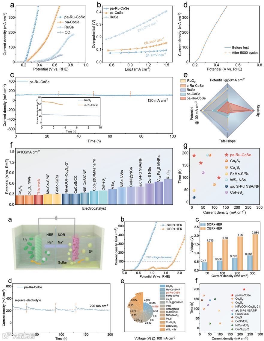 制备的pa-Ru-CoSe纳米颗粒结合了结晶和非晶两种结构的优点,在三电极体系中仅需0.273 V (vs RHE)就能达到100 mA cm−2的电流密度,并且在120 mA cm−2的电流密度下能够稳定运行100 h;同时,在SOR与HER耦合的系统中,该催化剂仅需0.566 V的电压就能达到100 mA cm−2的电流密度,并且在220 mA cm−2的电流密度下稳定运行200 h无明显衰减。