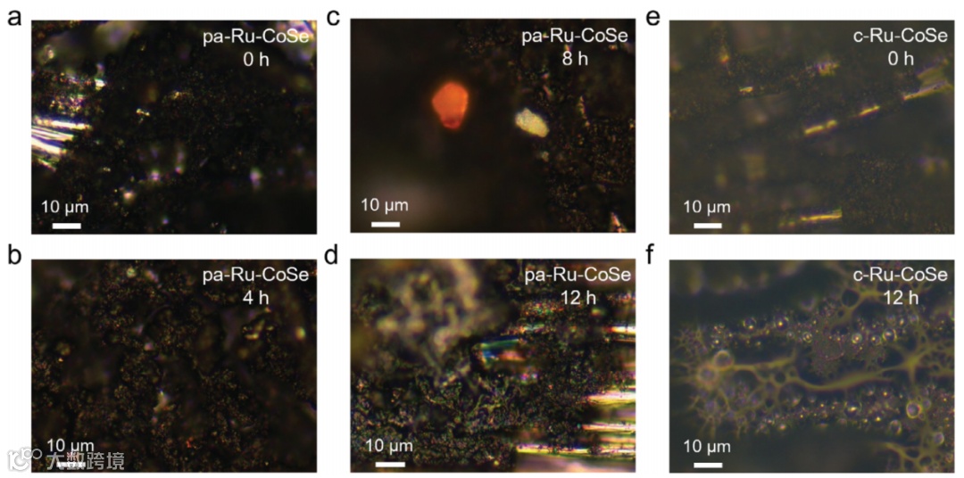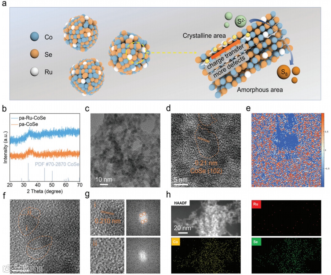 非晶材料存在大量缺陷,暴露较多的活性位点,有利于催化活性的提高;结晶态材料通常具有更好的导电性。因此,构建晶态和非晶态共存的异质结构材料可以保持两者的优点,即非晶态区域提供丰富的活性位点,晶态区域提供快速的电荷转移。制备的pa-Ru-CoSe具有部分非晶特性,即结晶态和非晶态共存。形貌表征表明这种结晶态和非晶态共存的特征表现在单个纳米颗粒上,这保证了单个纳米颗粒也能兼具非晶态和结晶态的优点,从而提高催化活性。