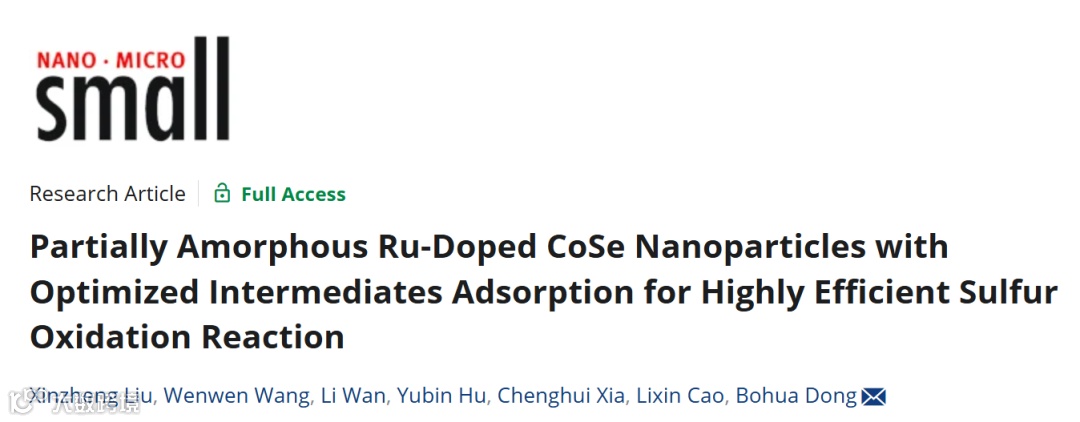 近日,来自中国海洋大学的董博华课题组在国际知名期刊Small上发表题为“Partially Amorphous Ru-Doped CoSe Nanoparticles with Optimized Intermediates Adsorption for Highly Efficient Sulfur Oxidation Reaction”的研究文章。该研究为SOR制备了部分无定形的Ru掺杂CoSe(pa-Ru-CoSe)纳米催化剂,表现出优异的SOR催化性能,解决了SOR电催化剂活性与稳定性相结合的难题。实验和原位拉曼光谱表明,pa-Ru-CoSe的催化活性来源于Ru的掺杂调节了Co的电子结构,使得催化剂对电解质中的硫离子和多硫离子保持了优异的吸附作用,降低了反应能垒,促进了SOR的持续高效进行。同时,特殊的结构促进产物S8的高效去除,确保反应运行稳定。