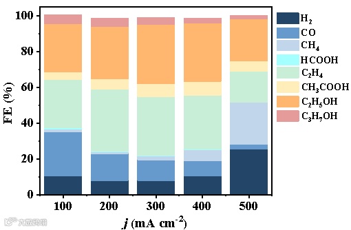 测试条件:通过MFC稳定控制CO2气体流速,采用辰华1140C大功率电化学工作站,先进行CV循环稳定,然后在恒电流下测试并收集气相和液液产物,将气相产物于岛津2014C系统气相色谱中检测,液相产物于布鲁克NMR400M中测试,所得数据进行气相和液相产物计算,得到法拉第效率与电流关系柱状图。