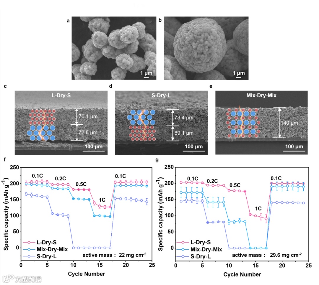 图2:双层结构电极的制造及其倍率性能。a, b) 小颗粒 (a) 和大颗粒 (b) 的形状。c–e) 不同负载下三种电极结构的横截面图像:L-Dry-S (c),S-Dry-L (d),和 Mix-Dry-Mix (e)。相应的电极负载约为29.6 mg cm−2。f, g) 不同负载下 NMC 83 电极(L-Dry-S,S-Dry-L,Mix-Dry-Mix)的倍率性能,包括 22 mg cm−2 (f) 和 29.6 mg cm−2 (g)。(1C = 210 mA g−1)。