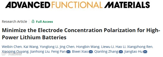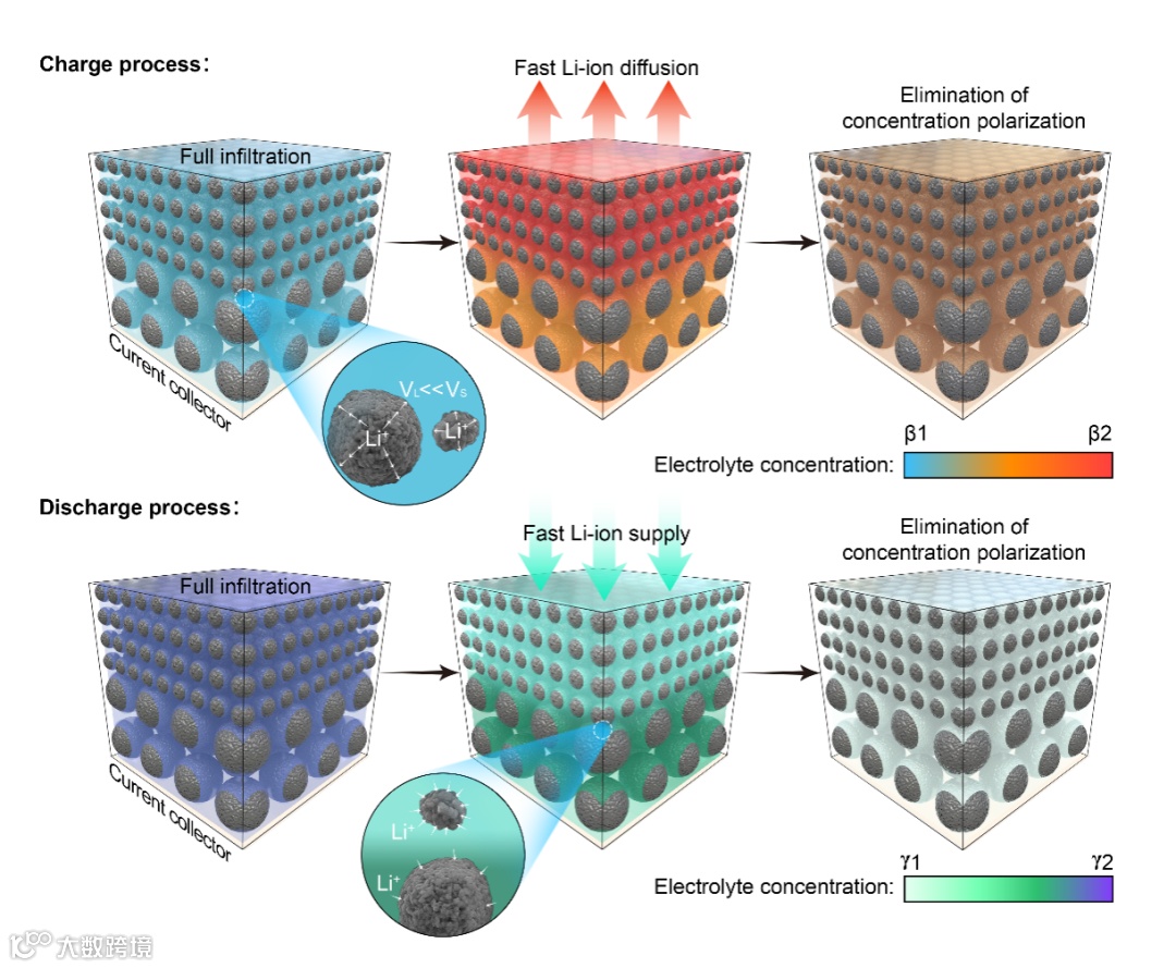 近日,来自深圳大学胡江涛、张黔玲教授,北京大学深圳研究生院的潘锋教授,有研(广东)新材料技术研究院肖必威教授合作,在国际知名期刊Advanced Functional Materials上发表题为“Minimize the Electrode Concentration Polarization for High-Power Lithium Batteries”的观点文章。该观点文章提出了一种创新的双层结构电极设计。通过采用不同尺寸的LiNi0.83Mn0.12Co0.05O2(NMC83)材料构建双层电极结构,其中底层由大颗粒(11.3 μm),顶层由小颗粒(4.5 μm)组成,在经过充分浸润后,电极内部电解液浓度分布均匀。在充电过程中,由于锂离子扩散速度不同(VL<