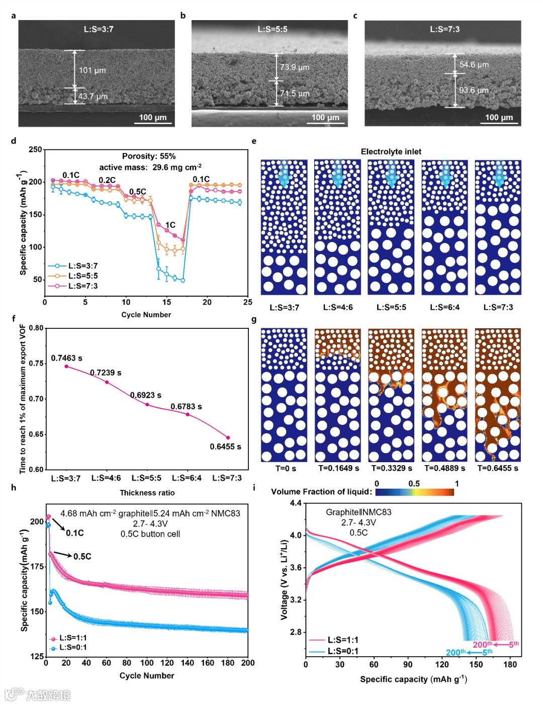 图5:双层结构电极最佳厚度比筛选。a–c) 不同 L/S 厚度比的 L-Dry-S 电极的横截面图像,包括 3:7 (a),5:5 (b),和 7:3 (c)。相应的电极负载约为29.6 mg cm−2。d) 不同 L/S 厚度比的 NMC83 电极 (L-Dry-S) 的倍率性能。e) 不同 L/S 厚度比的 L-Dry-S 电极的模拟模型。f) 达到最大出口体积分数1%的时间,五种不同 L/S 厚度比的 L-Dry-S 电极。g) L/S 厚度比为 7:3 时 L-Dry-S 电极中电解液渗透过程。h) 负载为 24.6 mg cm−2 的 NMC 83 电极 (L:S = 1:1 和 L:S = 0:1) 的循环性能。(1C = 210 mA g−1)。i) 在 0.5C 倍率下,石墨||NCM811全电池在 2.7–4.3 V 之间 200 个循环期间的典型充放电曲线,L:S = 1:1 和 L:S = 0:1。