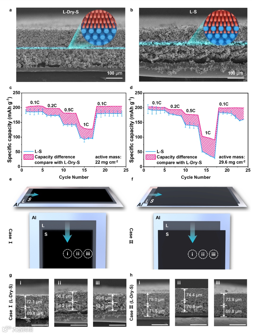 图3:双层结构电极制造技术的探究。a,b) L-Dry-S 电极 (a) 和 L-S 电极 (b) 的横截面图像。相应的电极负载约为29.6 mg cm−2。c,d) 不同负载下 S-L 电极的倍率性能,包括 22 mg cm−2 (c) 和 29.6 mg cm−2 (d)。e,f) 涂层工艺的示意图,包括案例 I (e) 和案例 II (f)。g,h) 案例 I (g) 和案例 II (h) 中区域 i,ii,和 iii 的 L-Dry-S 电极的横截面图像。比例尺为 100 μm。