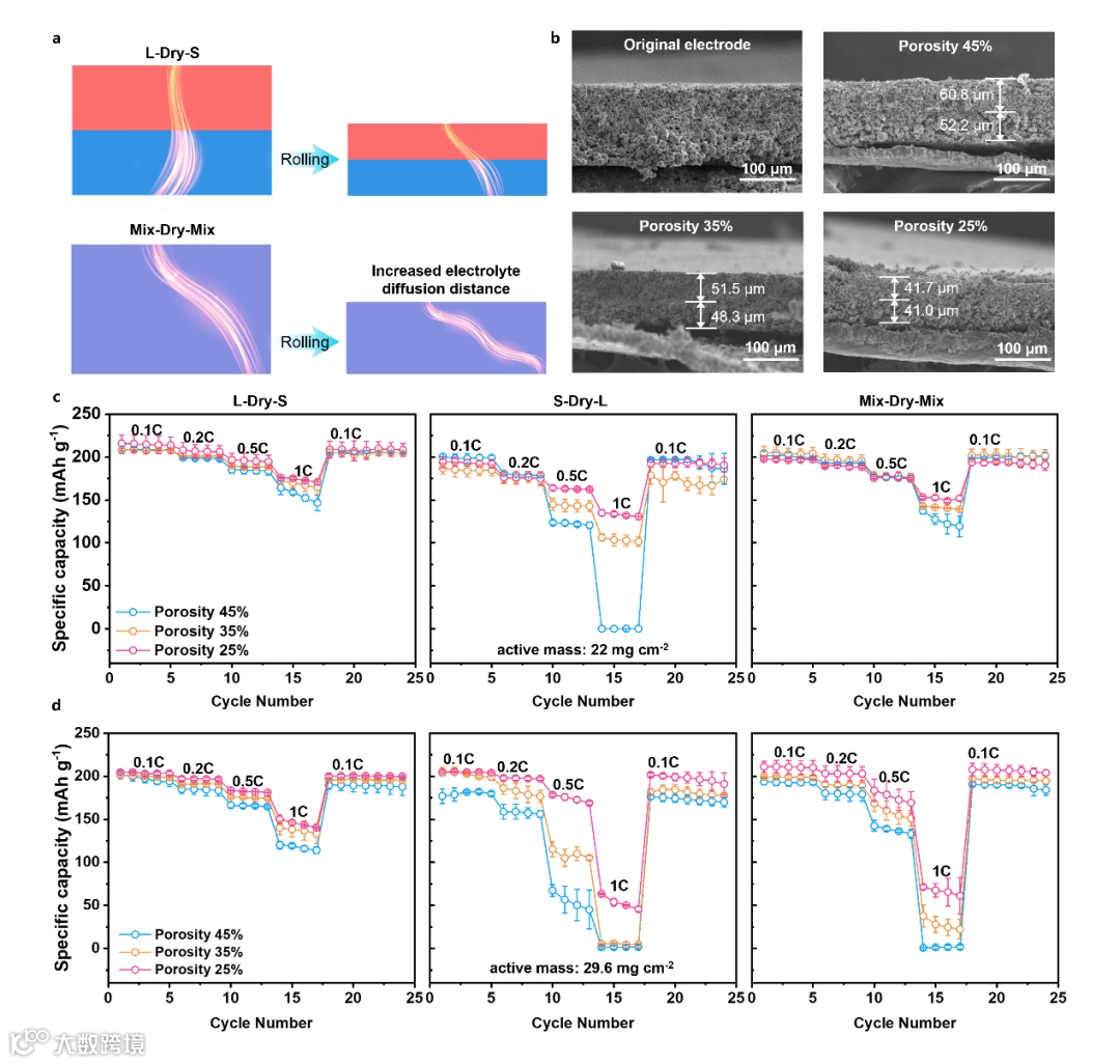 图4:双层结构电极孔隙率的探究。a) 传统电极和 L-Dry-S 电极的辊压过程示意图。b) 不同孔隙率 (45%,35%,和 25%) 的 NMC83 的横截面图像,相应的电极结构为 L-Dry-S。c,d) 在不同孔隙率和负载条件下 L-Dry-S,S-Dry-L,和 Mix-Dry-Mix 电极的倍率性能,负载为 22 mg cm−2 (c) 和 29.6 mg cm−2 (d)。