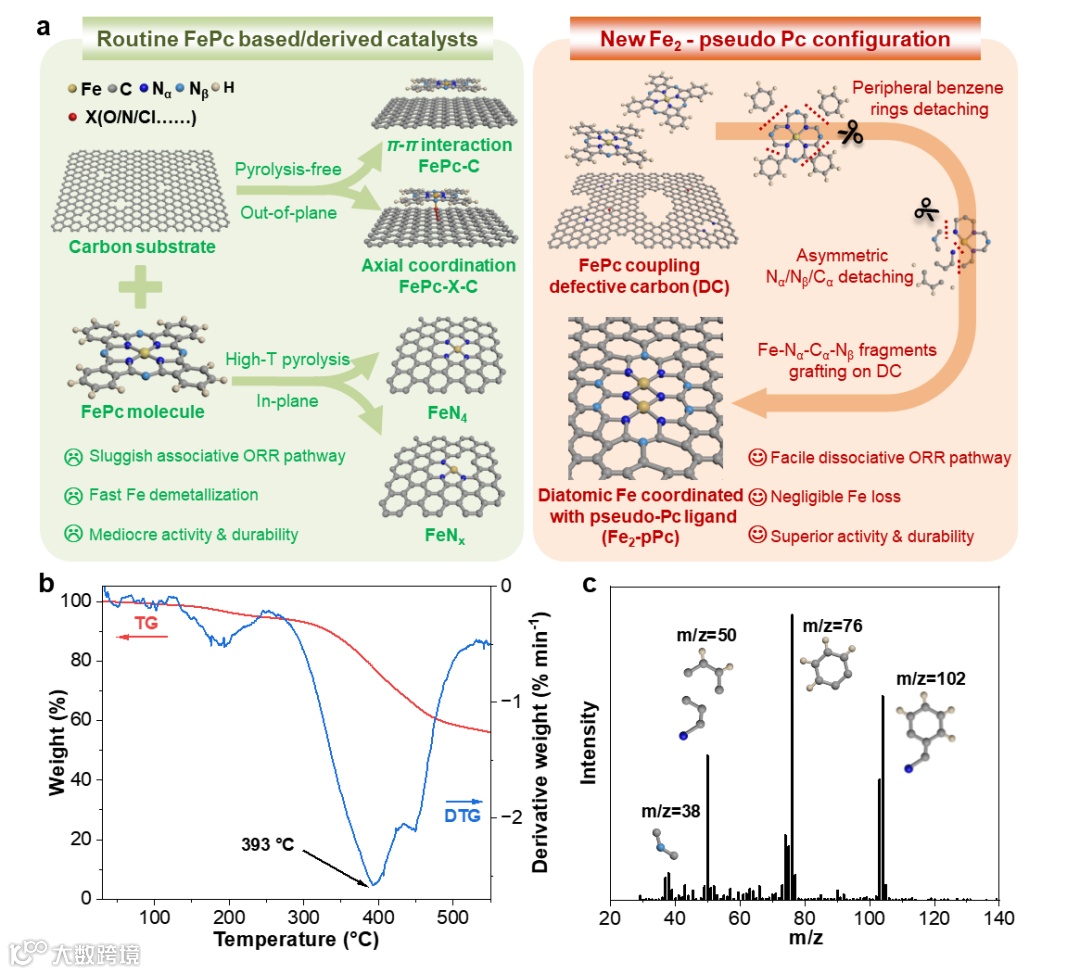 图2. (a)传统FePc基/衍生催化剂和新型Fe2-pPc催化剂的合成路径及电化学性能对比示意图。(b)FePc/defective carbon的TG/DTG曲线。(c)FePc/defective carbon在500°C热解的GC-MS分析。
