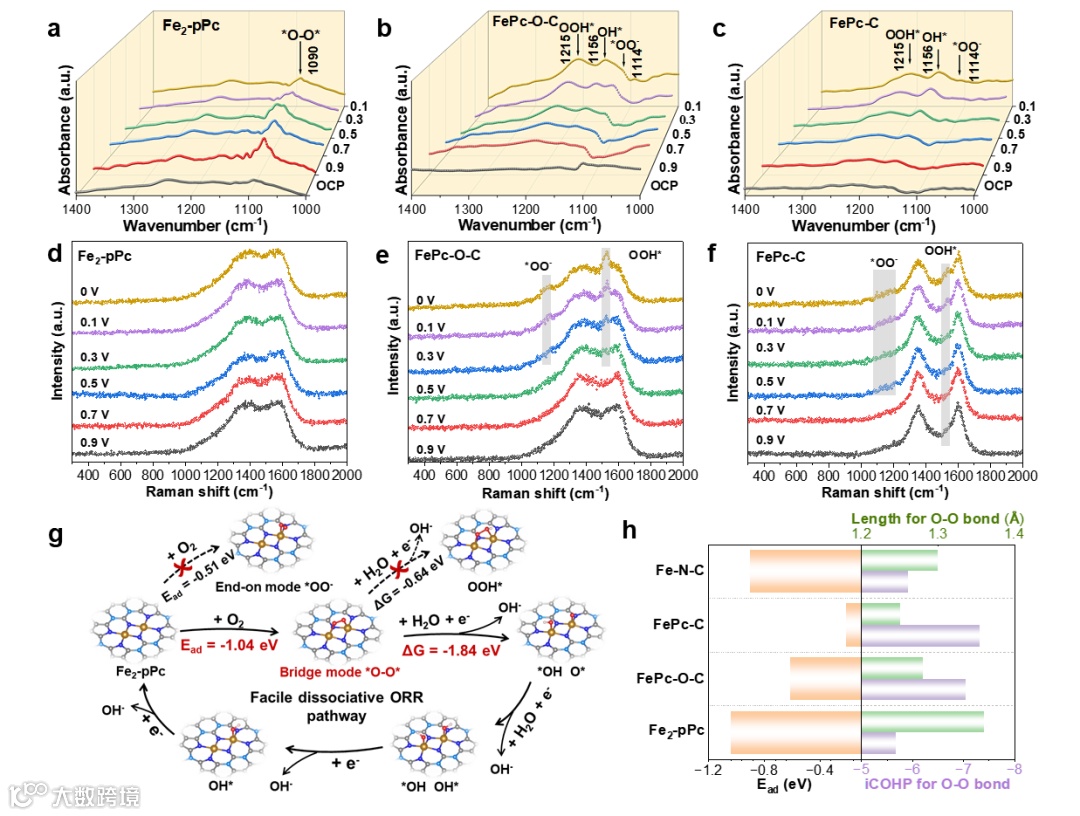 图5. 催化剂的(a-c)电化学原位红外测试和(d-f)电化学原位拉曼测试。(g)Fe2-pPc的ORR催化路径。(h)催化剂活性位点对氧气吸附的理论计算。