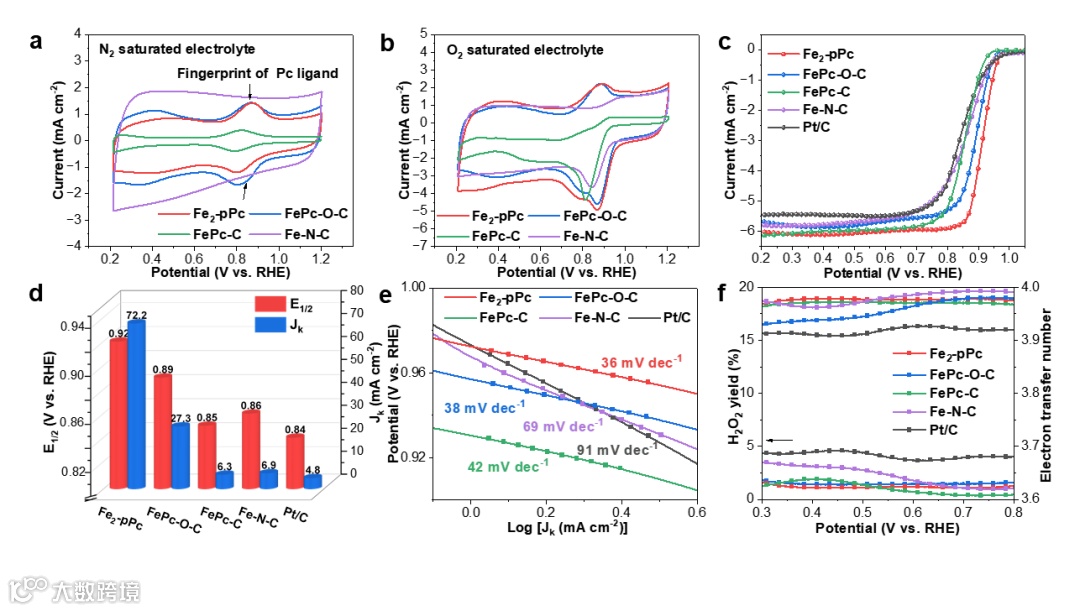 图4. 催化剂的电化学性能测试。(a)N2饱和环境下的CV曲线。(b)O2饱和环境下的CV曲线。(c)LSV曲线。(d)半波电位及动力学电流数据。(e)Tafel曲线。(f)过氧化氢及转移电子数。
