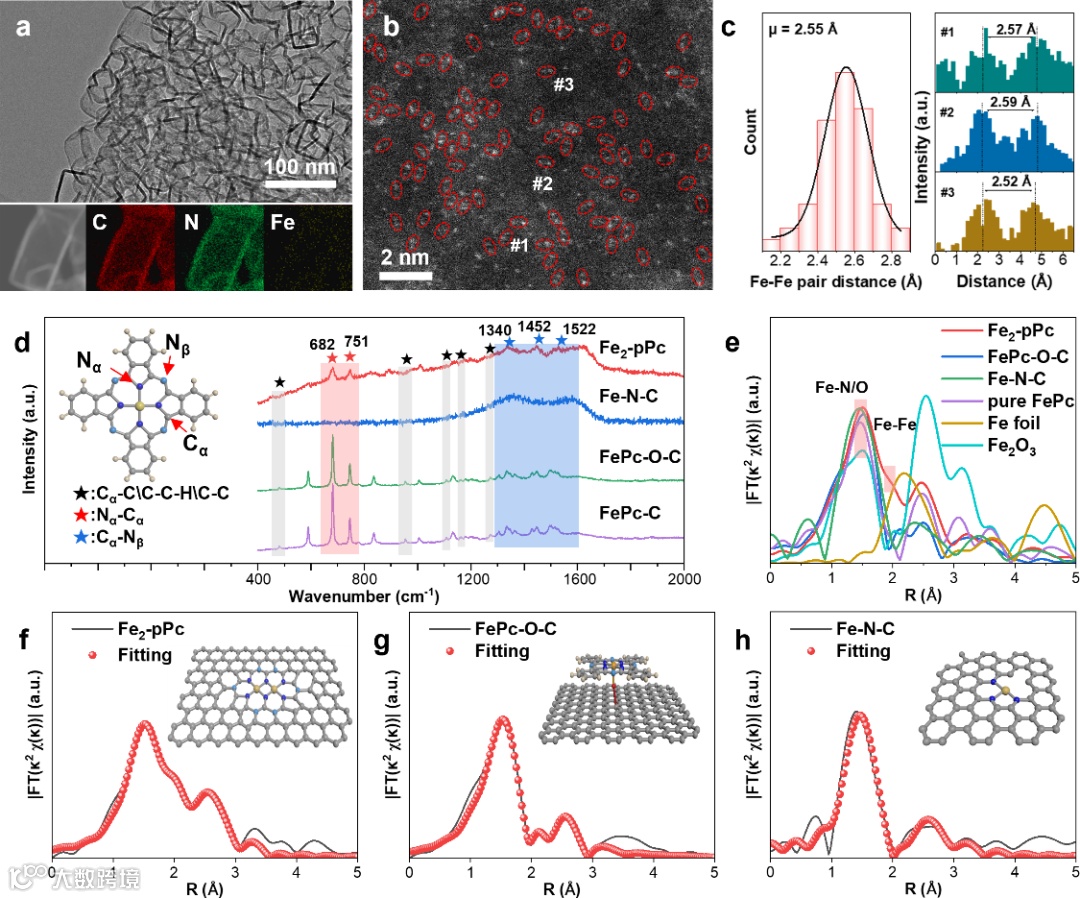 图3. (a)Fe2-pPc的HR-TEM图及元素分布图。(b)Fe2-pPc的AC-HAADF-STEM图及(c)对应的Fe-Fe距离直方统计图和选区距离强度图。合成的催化剂的(d)SERS光谱和(e)EXAFS图。(f-h)合成的催化剂的EXAFS拟合图。