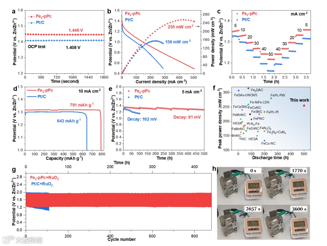 图 7. Fe2-pPc和Pt/C基锌空气电池的电化学测试性能。(a)OCP曲线。(b)LSV曲线及功率密度曲线。(c)不同放电密度的电压曲线。(d)恒电流放电曲线。(e)长期放电电压曲线。(f)Fe2-pPc基锌空气电池和先进锌空气电池的输出能力及放电稳定性对比图。(g)充放电曲线。(h)Fe2-pPc基锌空气电池驱动计时器工作的光学图。