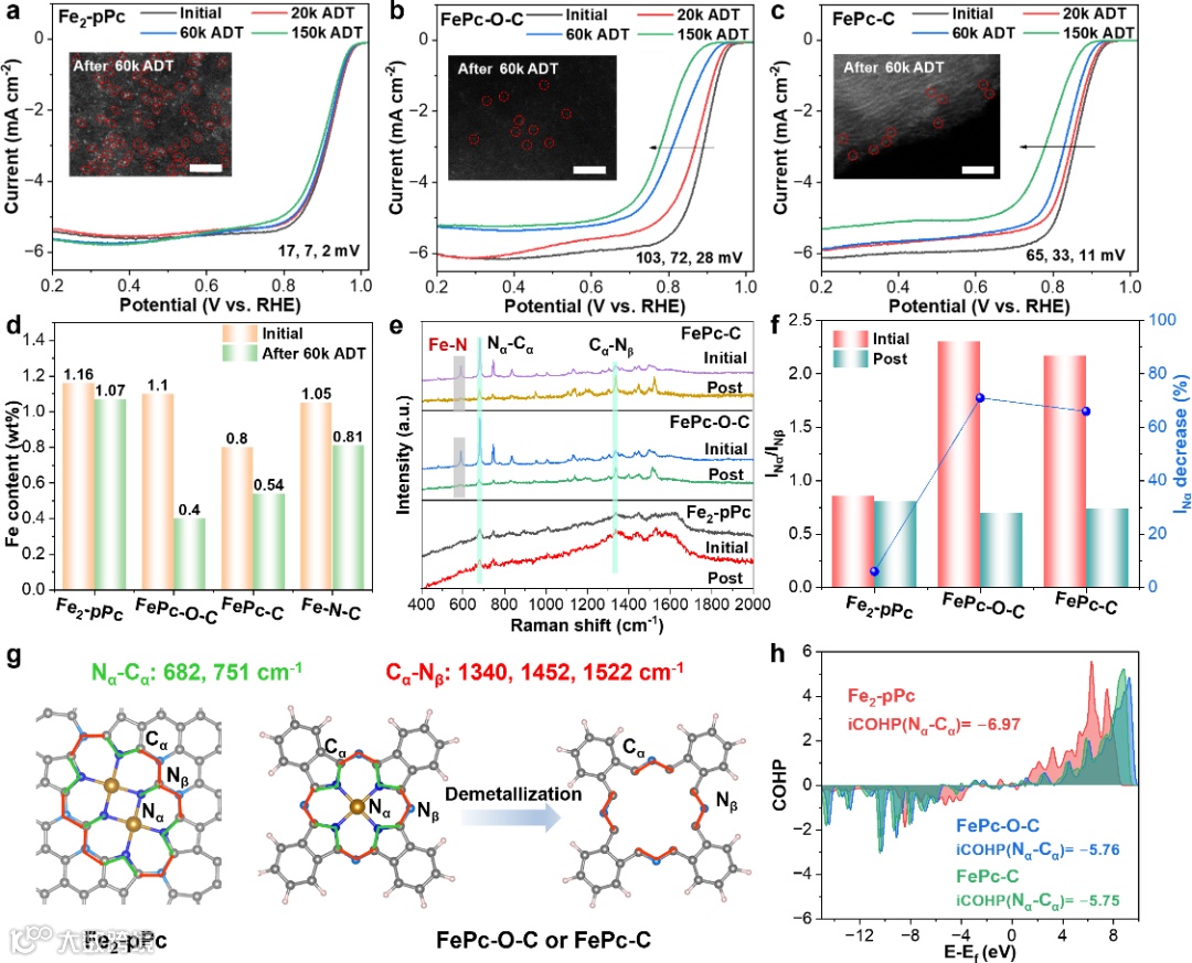 图6. 催化剂循环前后的(a-c)LSV曲线和(d)铁含量变化。(e)具有酞菁环境的Fe2-pPc和FePc基催化剂循环前后的SERS光谱及其中的Nα变化数据。(g)Fe2-pPc和FePc基催化剂稳定性测试中的结构演变图。(h)Fe2-pPc和FePc基催化剂中Nα-Cα键的COHP分析。