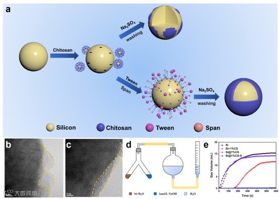 图2. (a) Si@CS和Si@CS-X样品的制备流程示意图。(b) Si@1%CS和(c) Si@1%CS-X的TEM图像。(d)产气实验的示意图。(e) 不同包覆硅Si与NaOH溶液反应释放气体的情况。