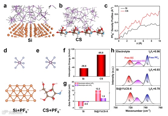 图4. (a-b) MD模拟和 (c) PF6-在硅和 CS 表面的吸附密度曲线。(d-e)PF6-成分与硅和CS的热力学稳定吸附构型。(f) 硅和CS对PF6-的吸附能。(g) Si和Si@1%CS-X在电解液(不含LiPF6-和含LiPF6-)中的Zeta电位。(h)电解液中Si和Si@1%CS-X的拉曼信号。