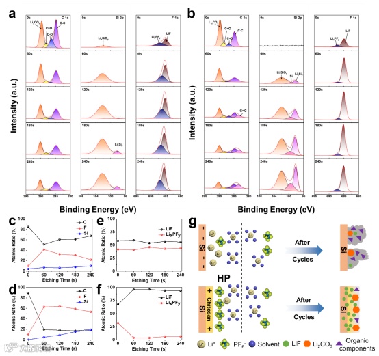 图6. (a) Si、(b) Si@1%CS-X负极在100个循环后的刻蚀 XPS 光谱。(c) Si和(d) Si@1%CS-X 负极的 C、F 和 Si 信号原子比随刻蚀时间的变化。(e)Si和(f)Si@1%CS-X 的Li和 LixPFy含量随蚀刻时间的变化。(g) Si和 Si@1%CS-X 上 SEI 形成的示意图