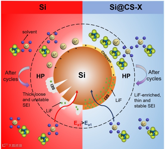 TOC图. CS层选择性吸附阴离子诱导形成富LiF的SEI示意图。