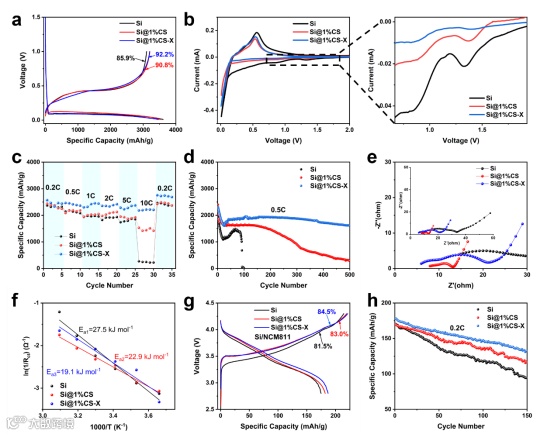 图5.Si、Si@1%CS和Si@1%CS-X 负极的电化学性能:(a)0.05C下的首次充放电曲线, (b)首次循环 CV 曲线, (c)倍率性能(1C=4200mA g-1),(d)长循环,(e)倍率测试后的电化学阻抗,(f) 阿伦尼乌斯曲线和计算得出的Rct在SOC=60%时的活化能。(g)以NCM811为正极的全电池在0.05C下的首次充放电曲线。(h) 全电池在 0.2 C(1C=220mA g-1)下的长循环性能。