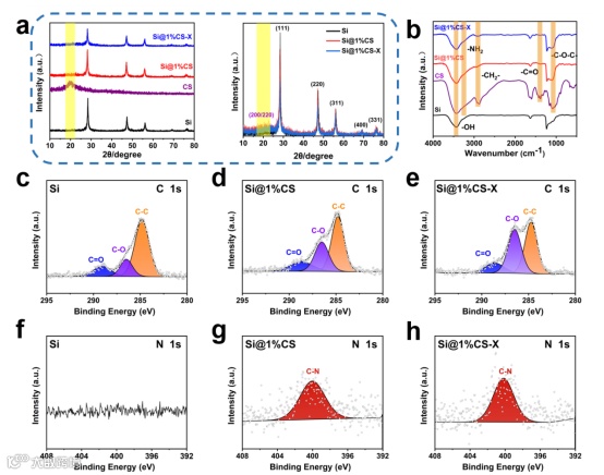图3. Si、Si@1%CS和Si@1%CS-X的光谱:(a) XRD光谱,(b)傅立叶变换红外光谱,(c-e) C 1s和 (f-h) N 1s XPS光谱。
