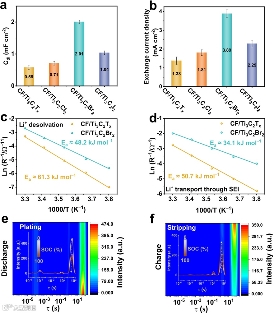 由于“电化学剪刀”效应,不同卤素末端的Ti₃C₂诱导形成富含不同卤化锂的SEI。这些SEI组分影响Li⁺在负极-电解质界面的去溶剂化以及在SEI中的扩散,从而影响锂沉积动力学。例如,富含LiF和LiBr的SEI具有高Li⁺导电性,可降低Li⁺在SEI中的扩散势垒,同时可以加速Li⁺的去溶剂化过程,进而促进Li的均匀沉积。