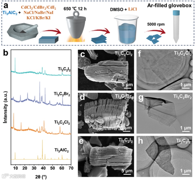 图2 单卤化末端(-Cl、-Br、-I)的Ti₃C₂ MXene材料的合成与表征