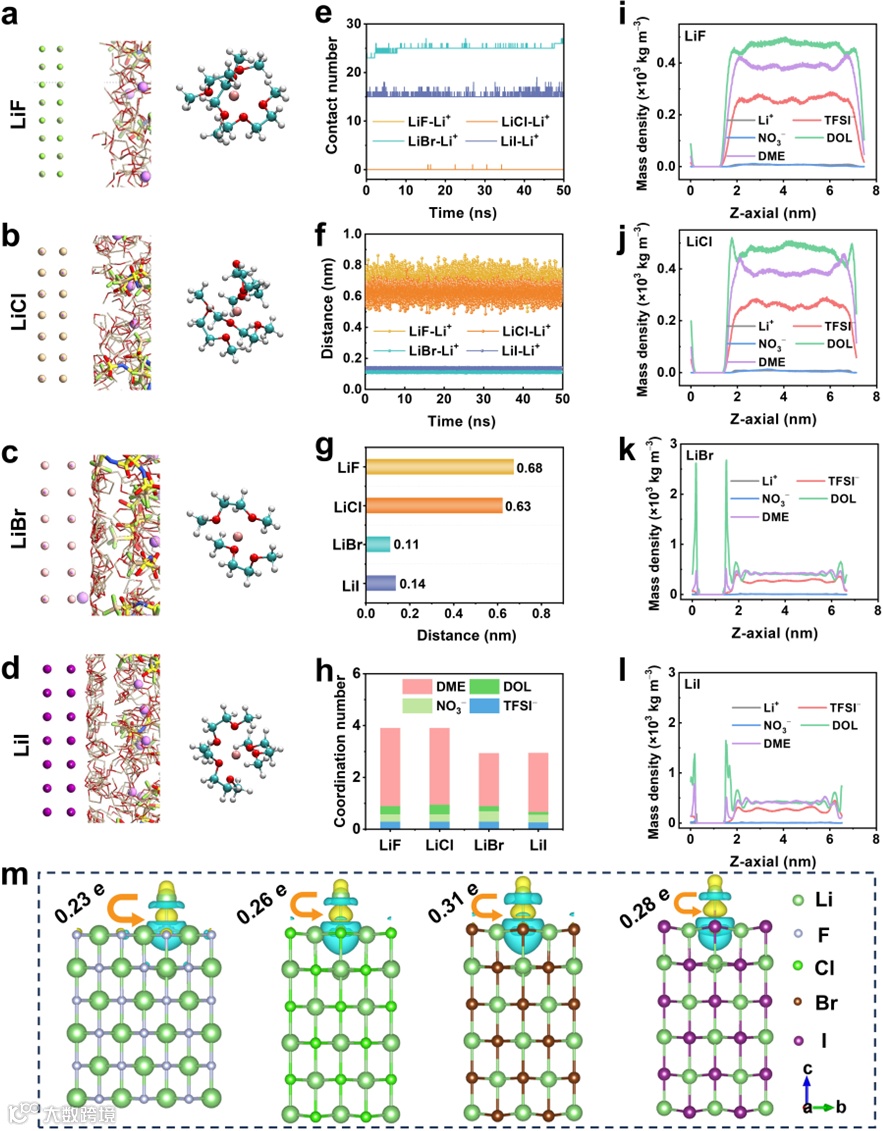 图1. 通过分子动力学模拟不同卤化锂-电解质界面的锂离子溶剂化结构以及位置分布。