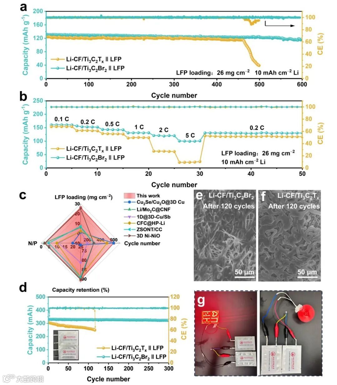 Li在CF/Ti₃C₂Br₂骨架上沉积/剥离的库仑效率高达99.45%。基于Li-CF/Ti₃C₂Br₂电极的对称电池表现出优异的性能,在1mA cm⁻² 和1mAh cm⁻²条件下寿命长达12000 h,同时具有出色的倍率性能。Li-CF/Ti₃C₂Br₂||LiFePO₄软包电池在N/P比为2.26的情况下,经过300次循环后容量保持率为97%。