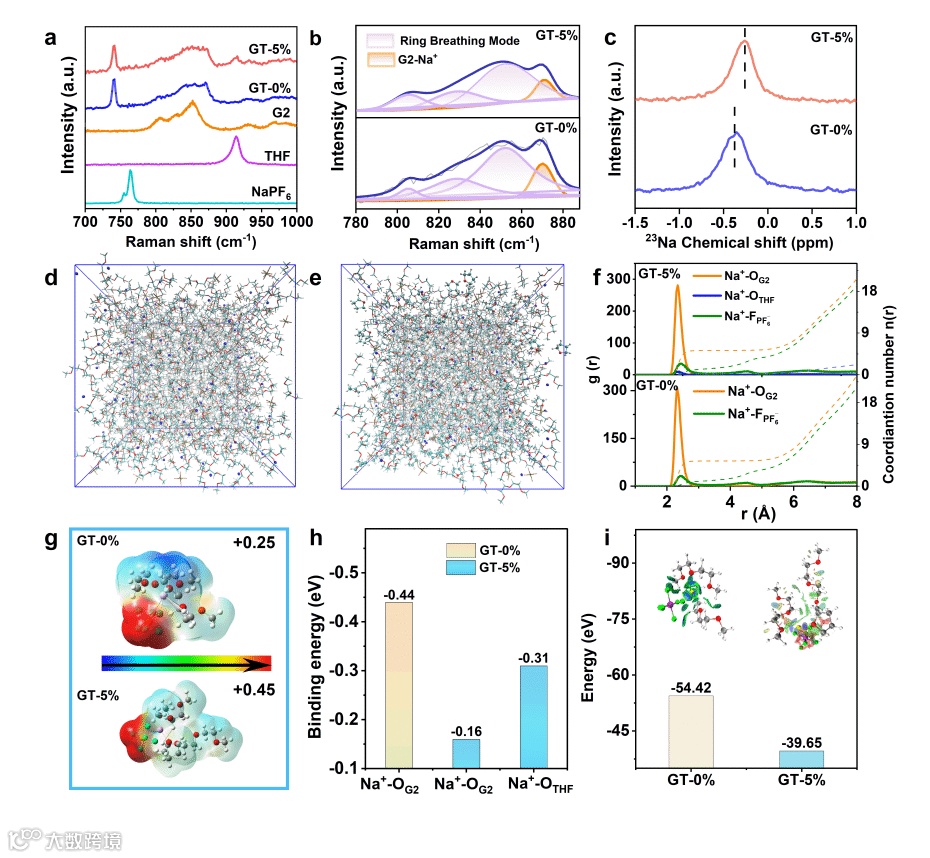 实验和理论计算分析发现THF分子的加入,降低了Na+-O(G2)的配位数并使得配位距离变远,构建了一种“疏松结构”,增加六氟磷酸根在溶剂化结构中的配位数,在降低Na+与溶剂之间的相互作用的同时有望构筑稳定电极-电解液界面。