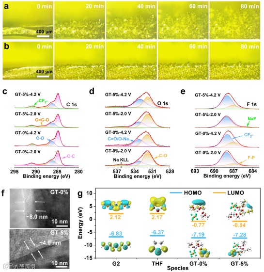 在金属钠负极方面,THF的加入可以有效抑制钠枝晶的生长,促进钠均匀沉积;在正极一侧,THF的加入可以在电极表面形成了组分更加稳定且薄电极-电解液界面。
