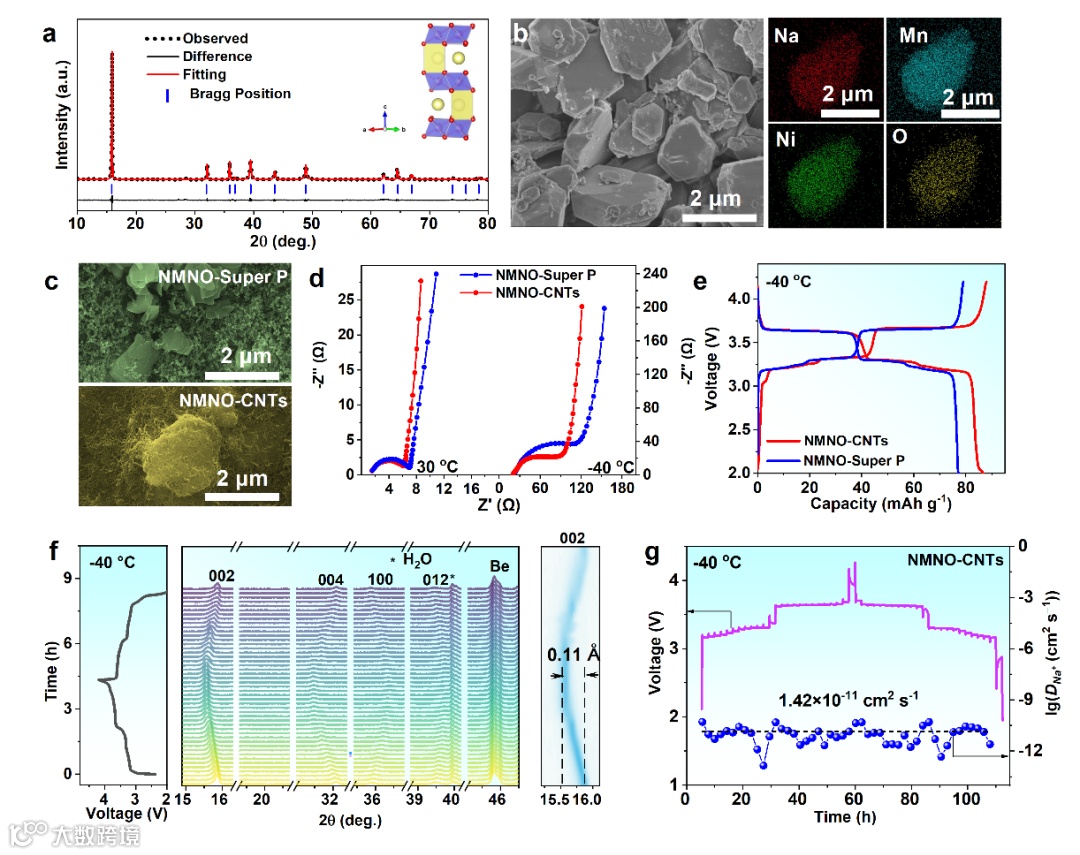 本研究通过引入碳纳米管导电剂构建三维导电网络提升了电子电导率,实现了卓越的低温性能。NMNO与CNTs复合后(NMNO-CNTs)表现出更低的低温电荷转移电阻和更高的电化学性能。